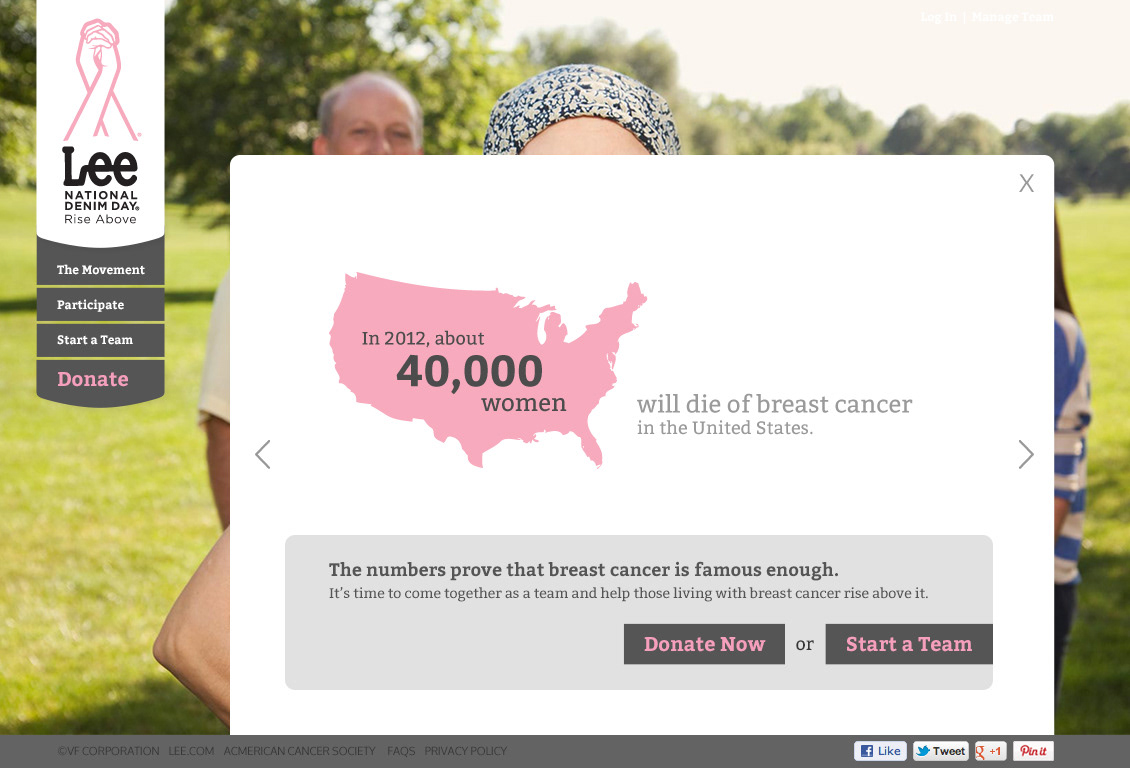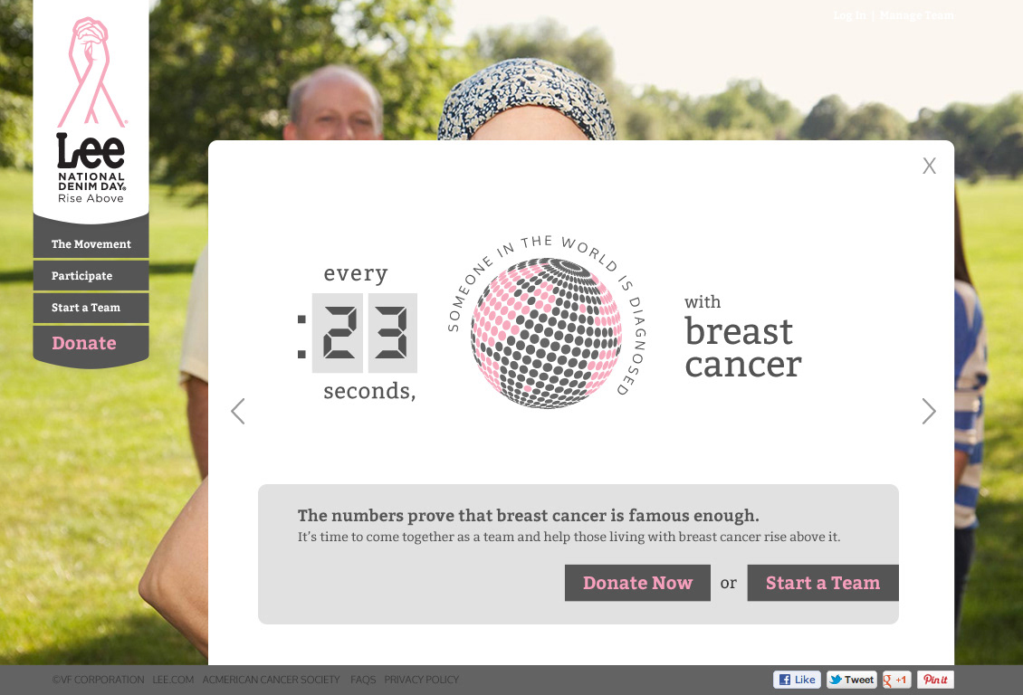 The website has many purposes: it explains the cause to those unfamiliar with it, promotes participation through online team management tools and tells the stories of partners Lee Jeans and American Cancer Society. The face of the campaign is Debbie, a breast cancer fighter backed by her loving team – her husband and two daughters.