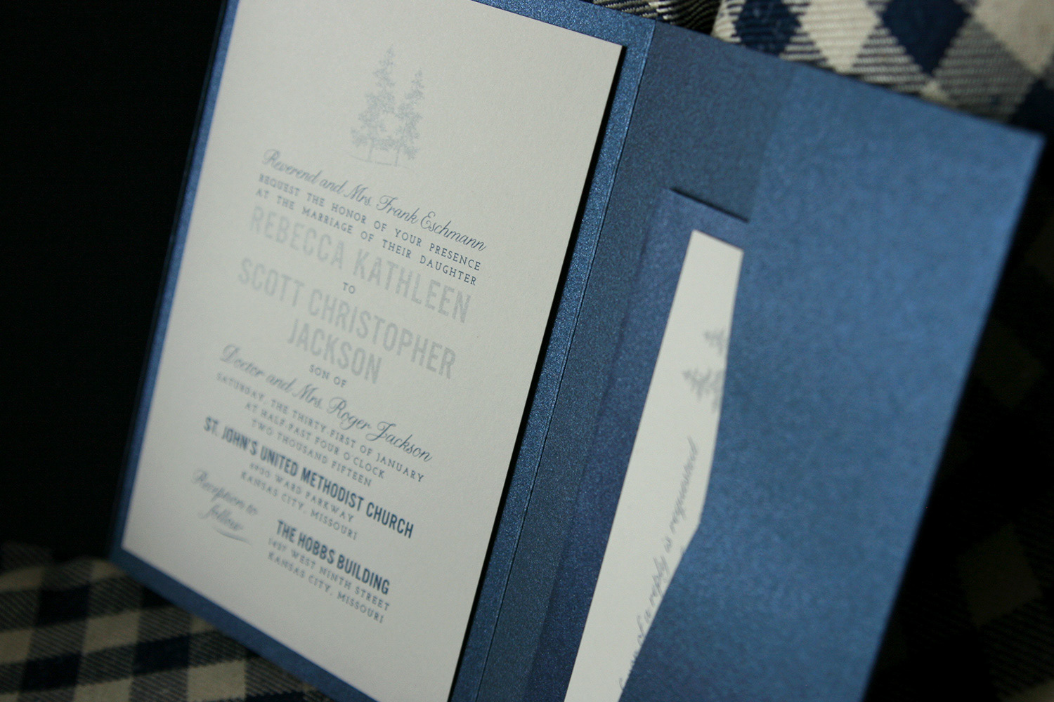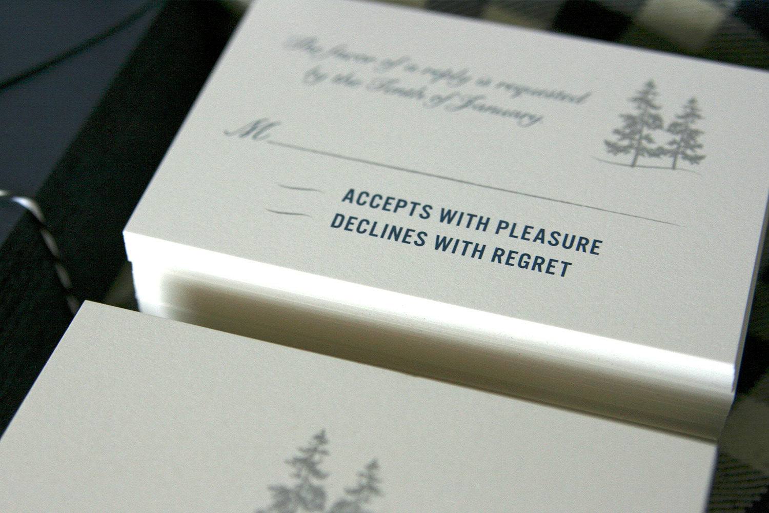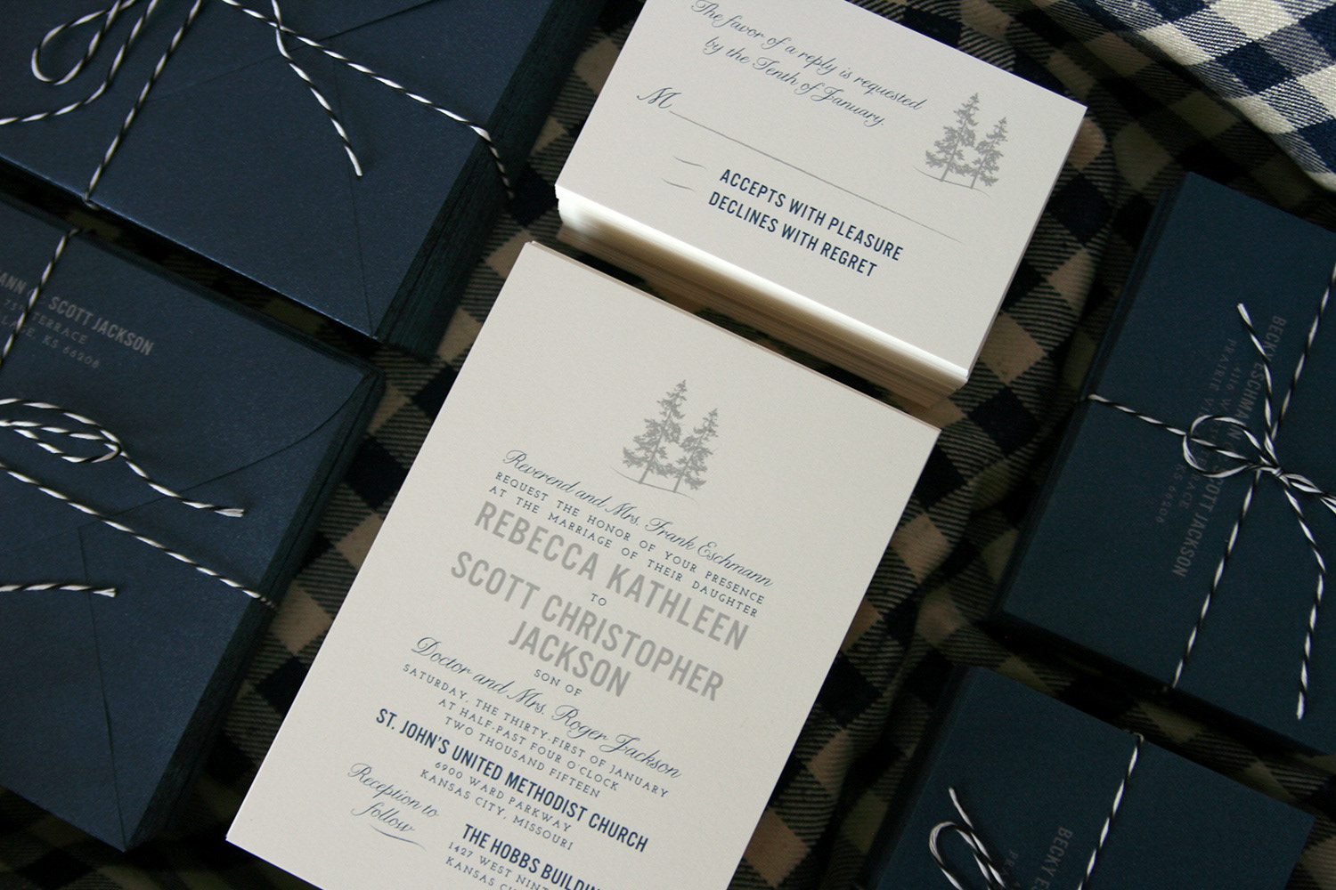 Rebecca and Scott’s Wedding is the idyllic combination of winter elegance and charm. Touches of silver and navy blue bring to live delicately frosted pine trees and a medley of typography.